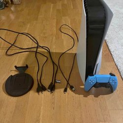 PS5 med kontroll, kablar och laddstativ.