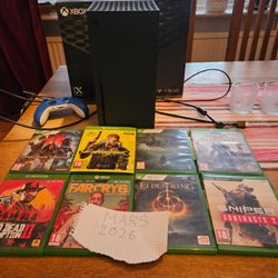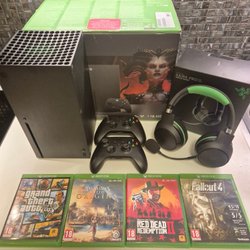 Xbox Series X med två handkontroller, headset och spel