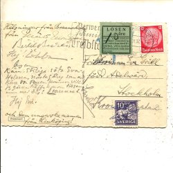 Lejon 10ö violett typ2 4s tdn som lösen på brevkort fr Tyskland t Stockholm 1937