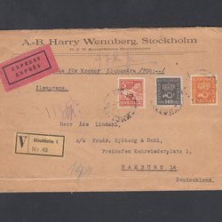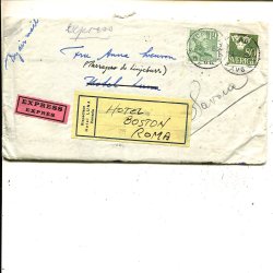 Tre Kronor 80ö+GV 10ö på expressbrev t Rom, Stockholm 22.8.1950, 10ö hörnskada
