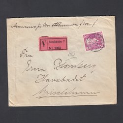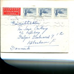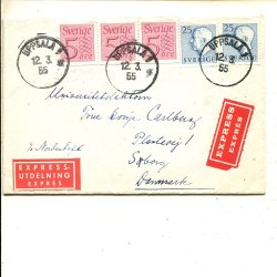 GVIA 2x25ö blå 3sid tdn+Siffertyp 3x5öre på expressbrev t Danmark, Uppsala 1953