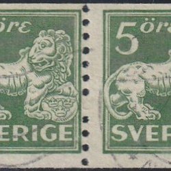 F143A par av stående lejon 5 öre grön stpl. Stockholm.