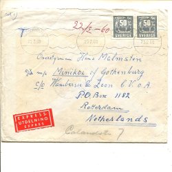 Hällristning 2x50öre på expressbrev t Nederländerna, Stockholm 5 23.2.1960