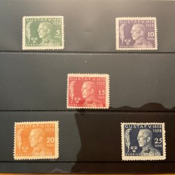 Postfriska frimärken med fastsättarspår Gustav V 70 år.