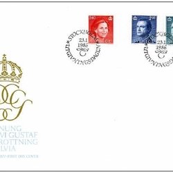 Sverige: FDC 1986. Carl XVI Gustaf 2.10 kr, 2.90 kr, Silvia 3.40 kr. Se bilder