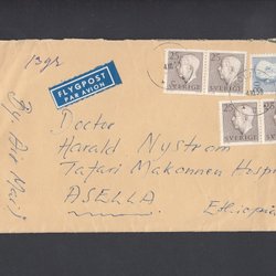 Luftpost 1.30kr 13gr till Svensk läkare i Asella Etiopien. Solna 4.10.1958 "B/U"