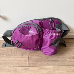 Midjeväska, lila, många fack, flaskhållare
