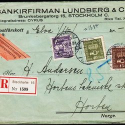 1920. Krone og Posthorn. 40 öre olivengrön. Postförskott 8 Kr. 80 öre.
