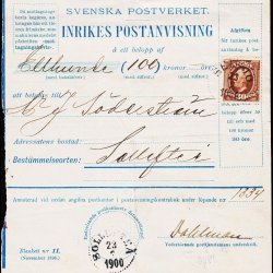 1900 - POSTANVISNING m. Oscar II - 30 öre brun - SELLSJÖ + SOLLEFTEÅ