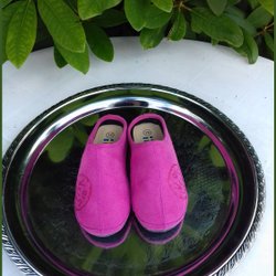 Skinntofflor cerisa med yllefoder i grått s 20 im 12 cm