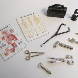 Doktorsväska och en massa doktorsinstrument till dockskåp, nytt och oanvänt