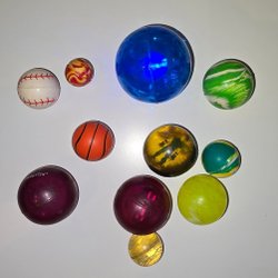 Blandade studsbollar, 10 stycken + 1 st blinkande blå plastboll.