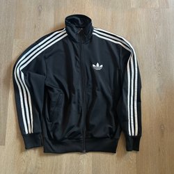 Adidas svart jacka med vita ränder längs ärmarna storlek M.