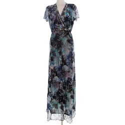 VIA VENETO Dam Maxiklänning 44 Blå Kort ärm Spetsbroderi Lång V-ringning