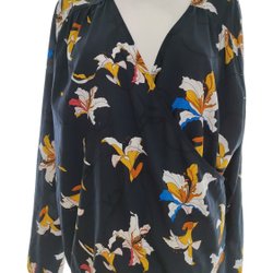 H&M kort mörkblå mönstrad topp blus med rosa vita rosetter, stl 38 / S/M