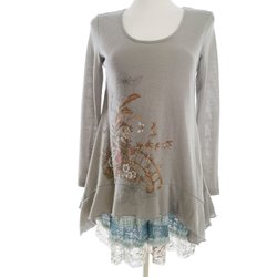 CO2 Dam Tunikablus S Grå Lång ärm Spetsbroderi Rund urringning