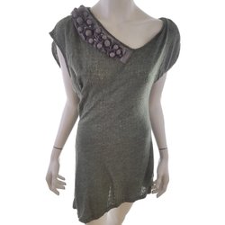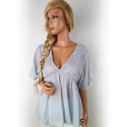 MISS REAL Tunikablus L Grå Bomull Kort ärm Pärlor V-ringning