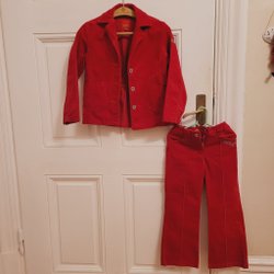 Mjukis-dress i rött. Kofta med knäppning av tryckknappar o utsvängda Byxor st 98