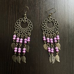 Mörk mässing hängande örhängen, fjädrar, bohemisk, boho, dangly, lila, pärlor