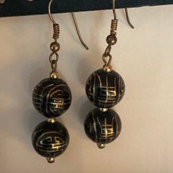 Hängande örhängen med två svarta porslinspärlor med guldfärgat mönster (5507)