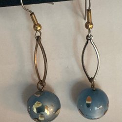 Guldfärgade örhängen med blå hängande pärlor med målat guldmönster (5509)