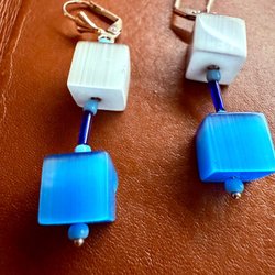 Lyxiga retro örhängen – blå & pärlgrå kubdesign, 5 cm
