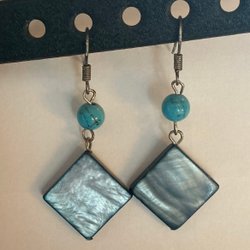 Örhängen med turkos pärla och hängande blå pärlemors bricka (5505)