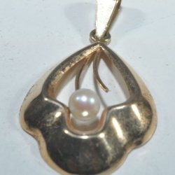 Hänge med pärla, längd 3cm bredd 1,8 cm. 18k 1 pärla saknas. 1,4 gr , V17426