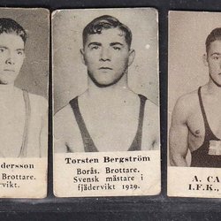 3 svenska brottare från Alfa-serien Olympiaskylt 1936. Bla Ivar Johansson