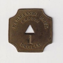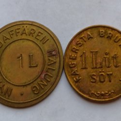 Polletter. Nya Brödaffären Malung + Fagersta Bruk 1 Lit Söt. Mässing. Ut 1:-