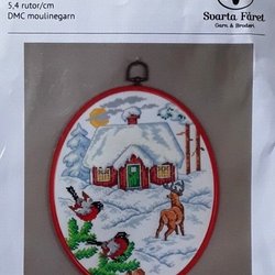 Komplett broderi - Tavla med stuga hjort och domherrar - Jultavla / Vintertavla
