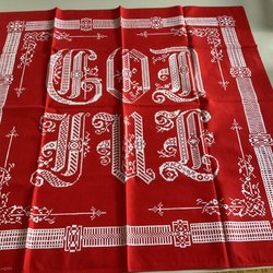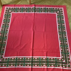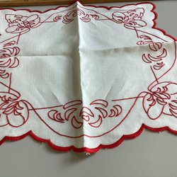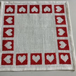 Linneväv med rött pärlgarn langetterad kant ,så vackert…