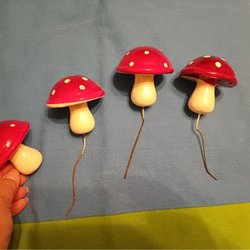 Fyra dekorativa flugsvampar i plast. Passar till jul. . Oanvända.