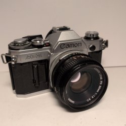 Svart Canon AE-1 35mm filmkamera med Canon FD 50mm f/1,8 S.C. objektiv