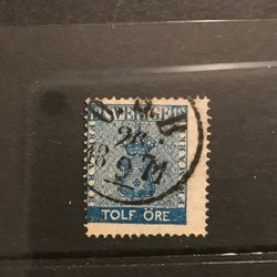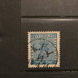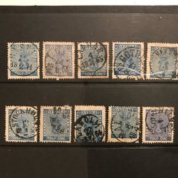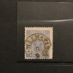 1858. Vapentyp II, öre. Facit nr: 9. Femton frimärken 12 öre, nyanser stämplar