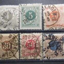 1886-91 RINGTYP MED BLÅTT POSTHORN (6 ST. OLIKA ÄLDRE FRIMÄRKE) STÄMPLAT