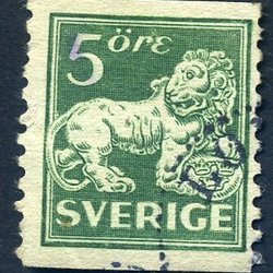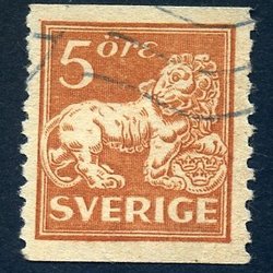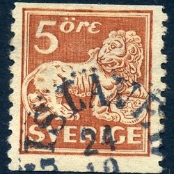 F143Cc Stående lejon 5 öre mörkgrön-grön 4-sid. stpl. Halmstad 28.2.26
