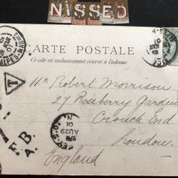 Vykort från Frankrike till England med många stämplar