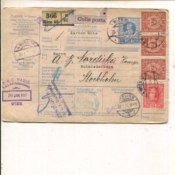 Austria 3x80+15h on parcel card to Sweden, Wien 20.1.1917. Perfins PCH