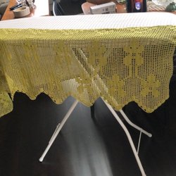Äldre virkad gardinkappa plus några dukar.