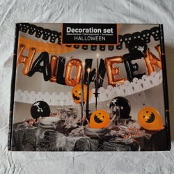 Halloweendekorationer med ballonger, duk, spindelnät mm