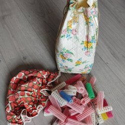 Vintage hårrullar/papiljotter, förvaringspåse, hätta/duschmössa. 50-tal.