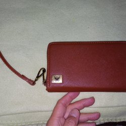 Brun plånbok i någon typ av plastat material. Flera fack för kort.