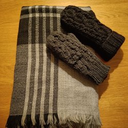Grå halsduk och gråa och svarta vantar