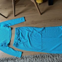 1970's vintage knitted two-piece teal/turquoise sweater & skirt set size EU 48