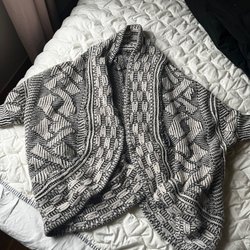 Mormors svarta poncho med fransar. Virkat hålmönster och en avslappnad passform.