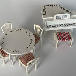 Lundby retro flygel med pall och bord med fyra stolar