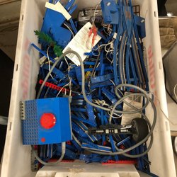 Kasse med LEGO tog deler skinner el giver mm