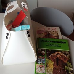 Garn, stickor & två böcker med stickmönster i en vit plastväska