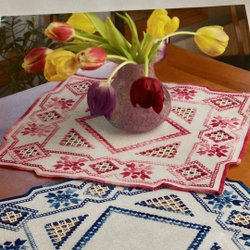 Broderi mindre duk, sys i rosamelerat och vitt garn